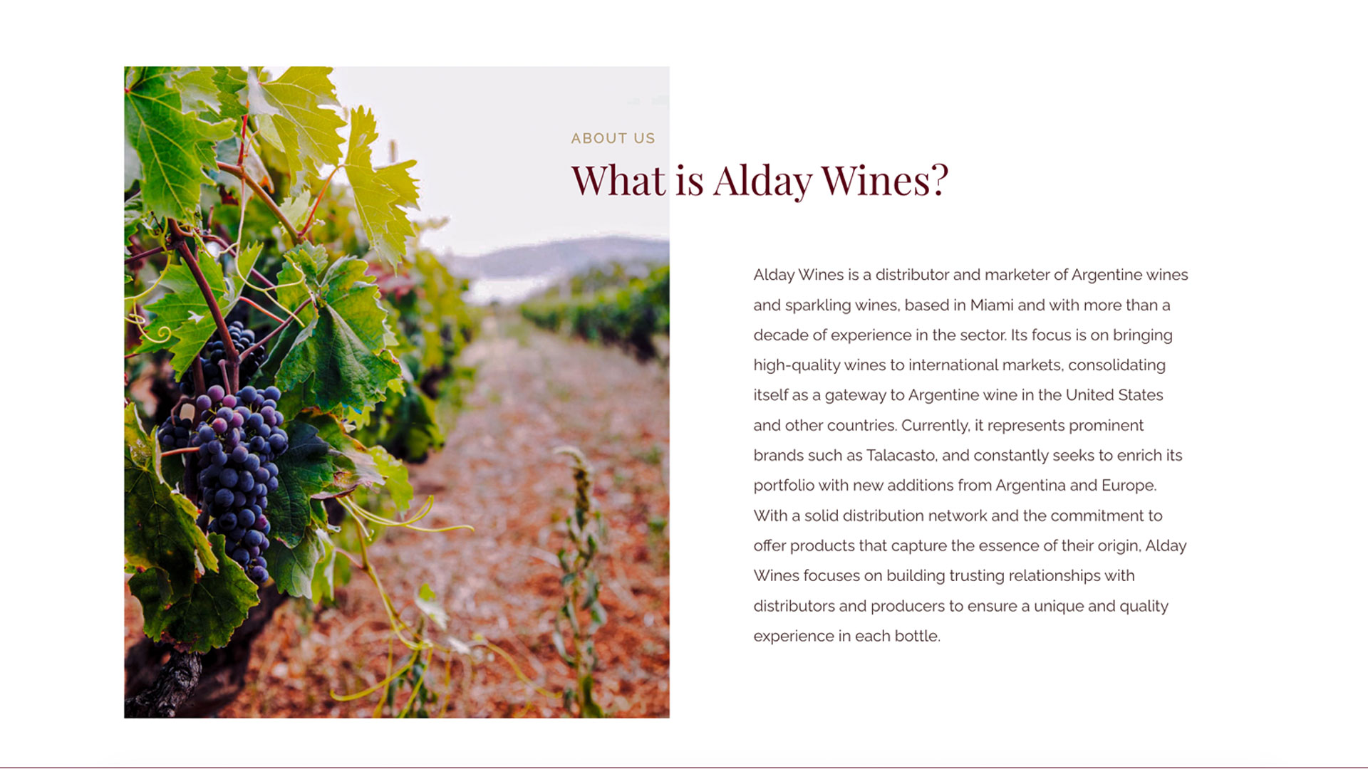 Uno de los principales objetivos fue crear una web que permitiera presentar el portafolio de vinos de manera atractiva y organizada, destacando el origen, las bodegas representadas y la identidad de cada etiqueta.